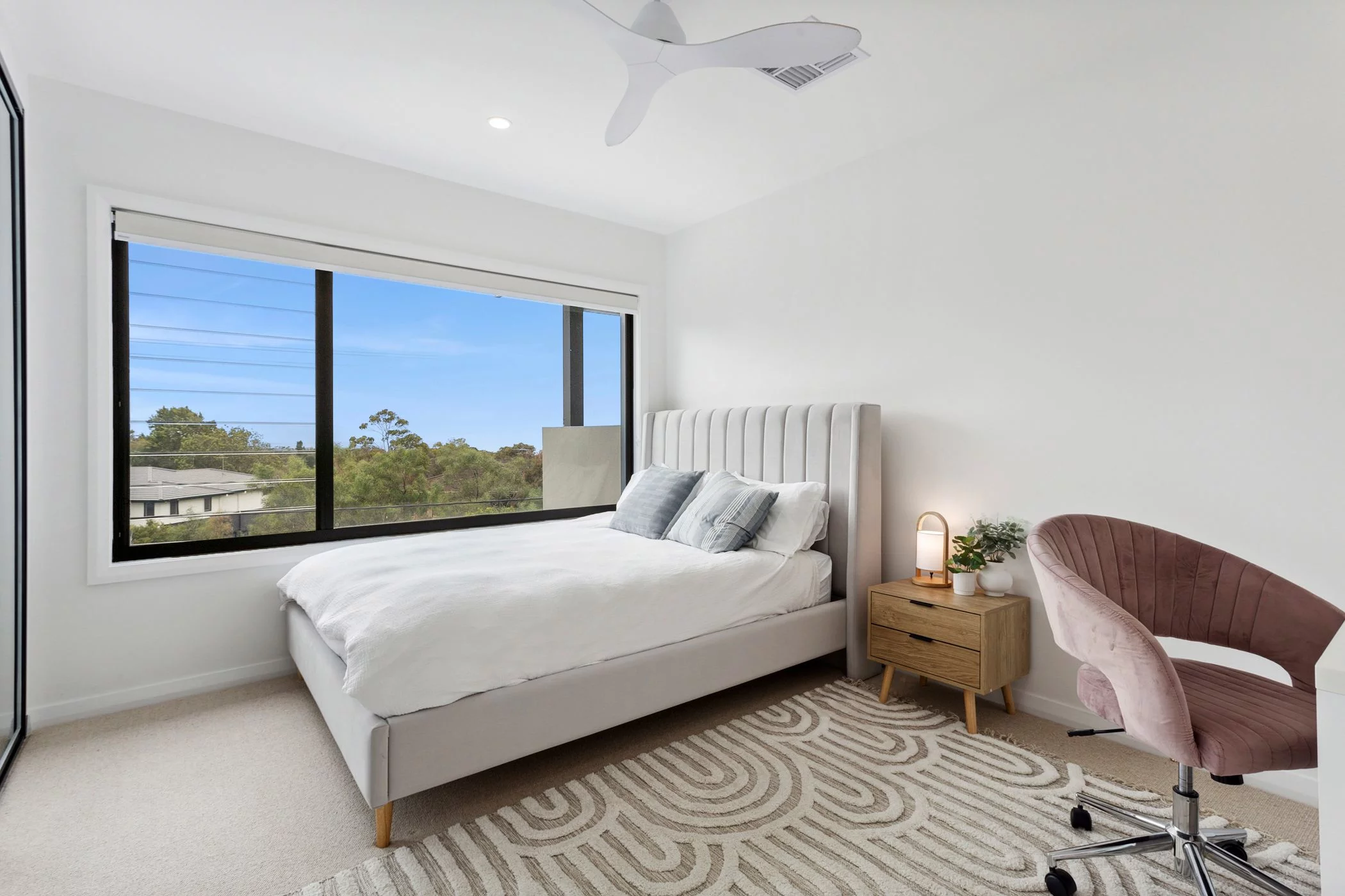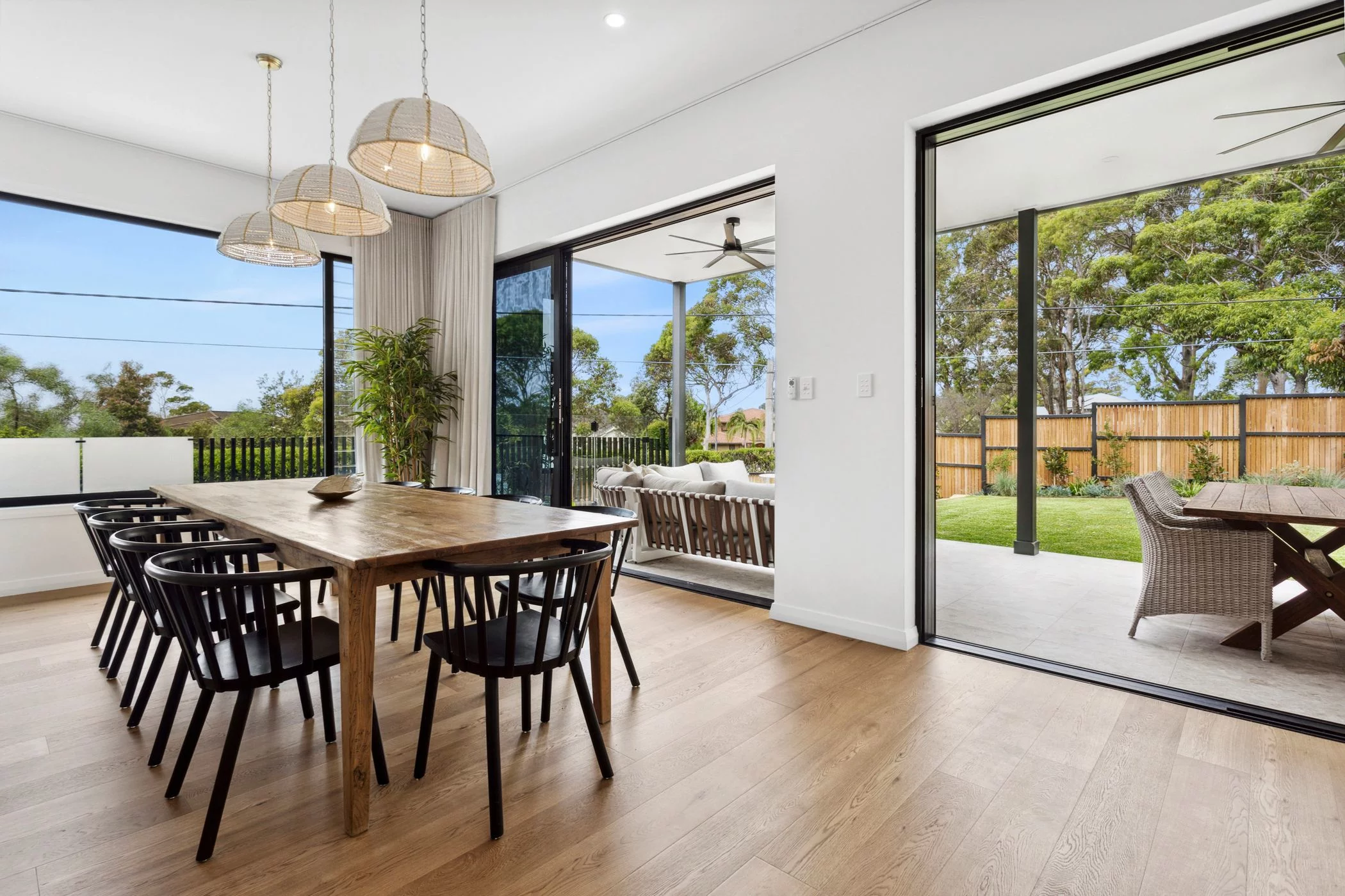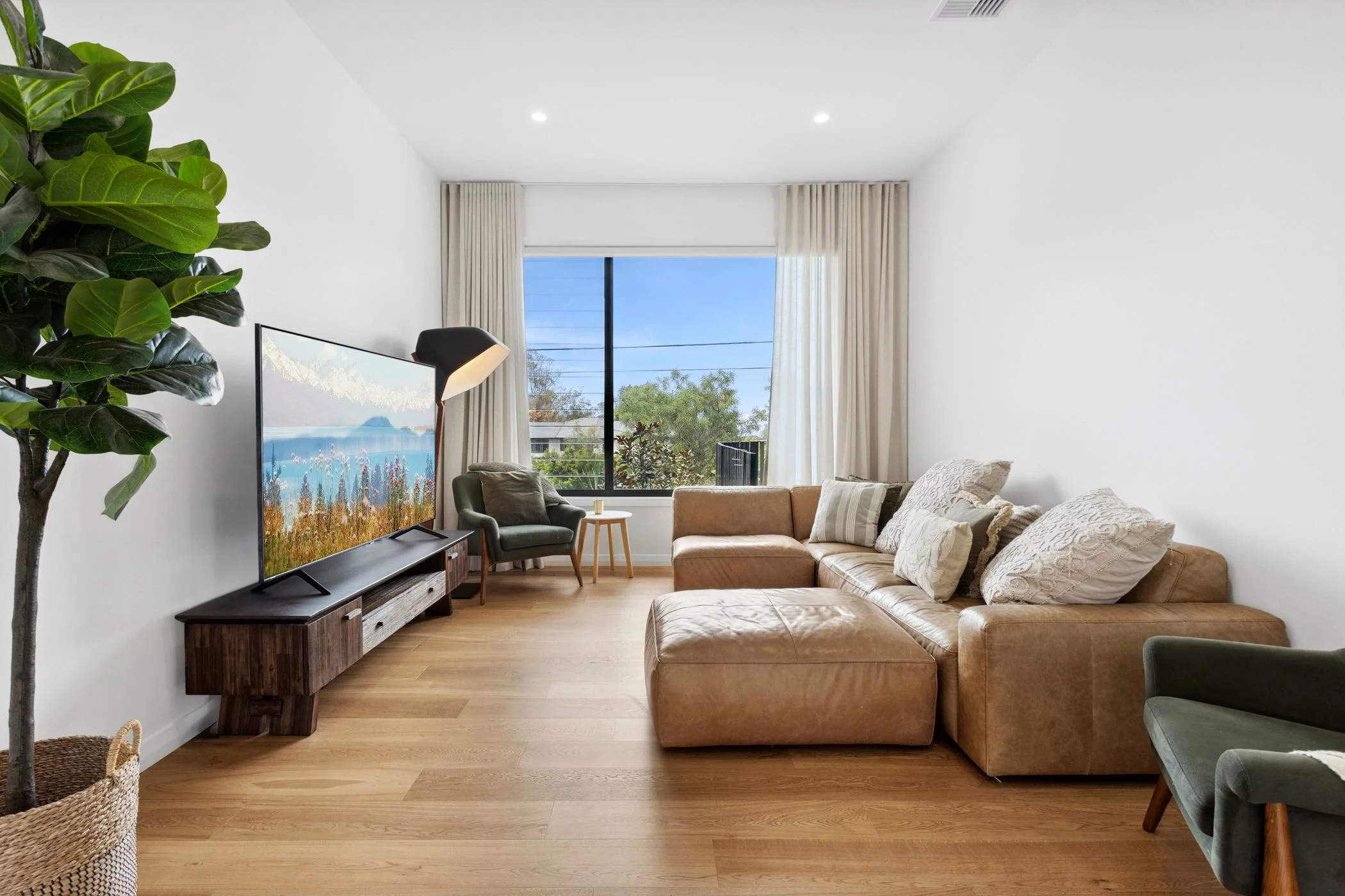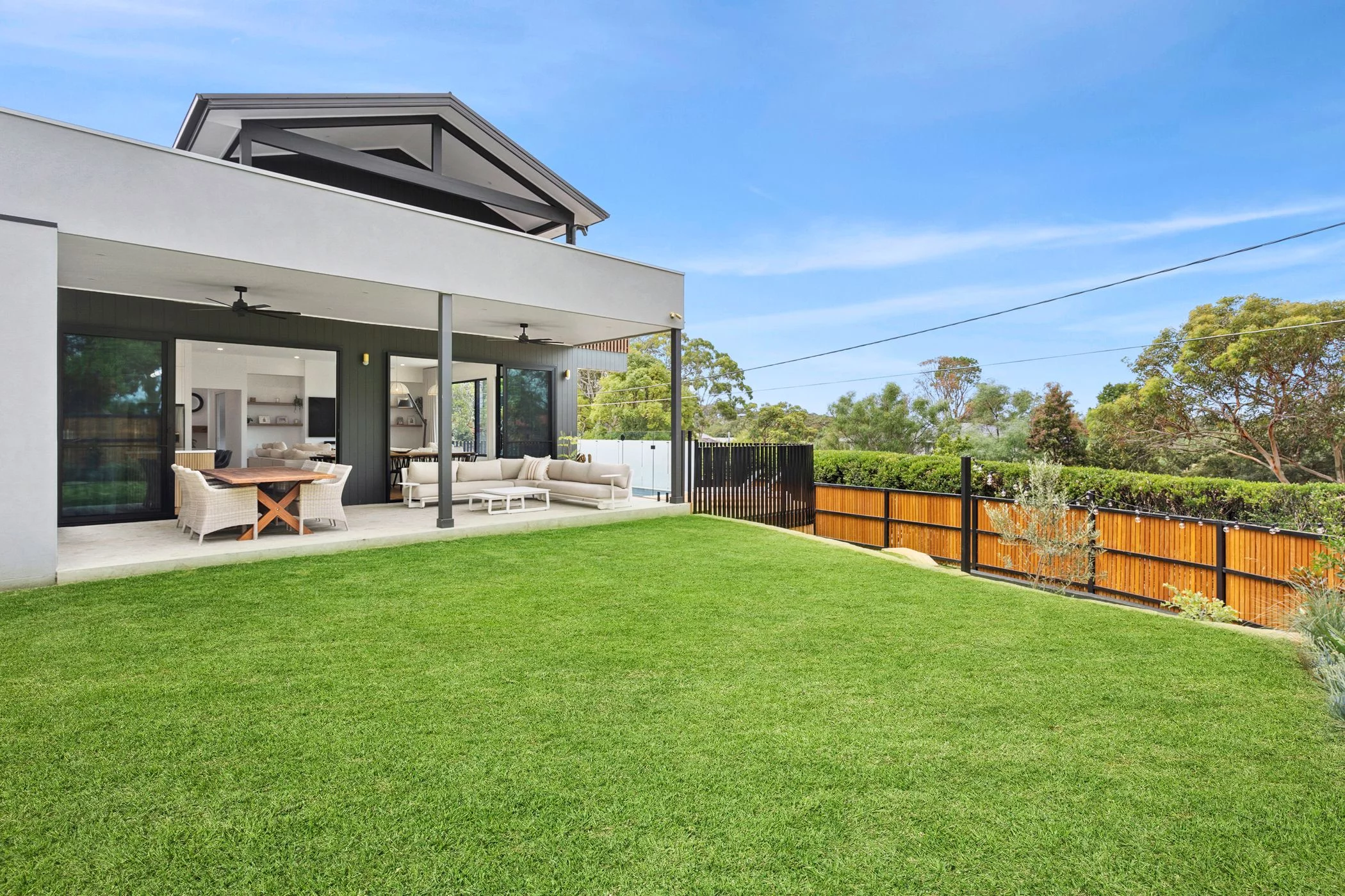 The interior palette is warm and grounded, pairing timber flooring with clean, contemporary finishes. Multiple living zones allow for separation when needed, while still maintaining an overall sense of openness and flow.