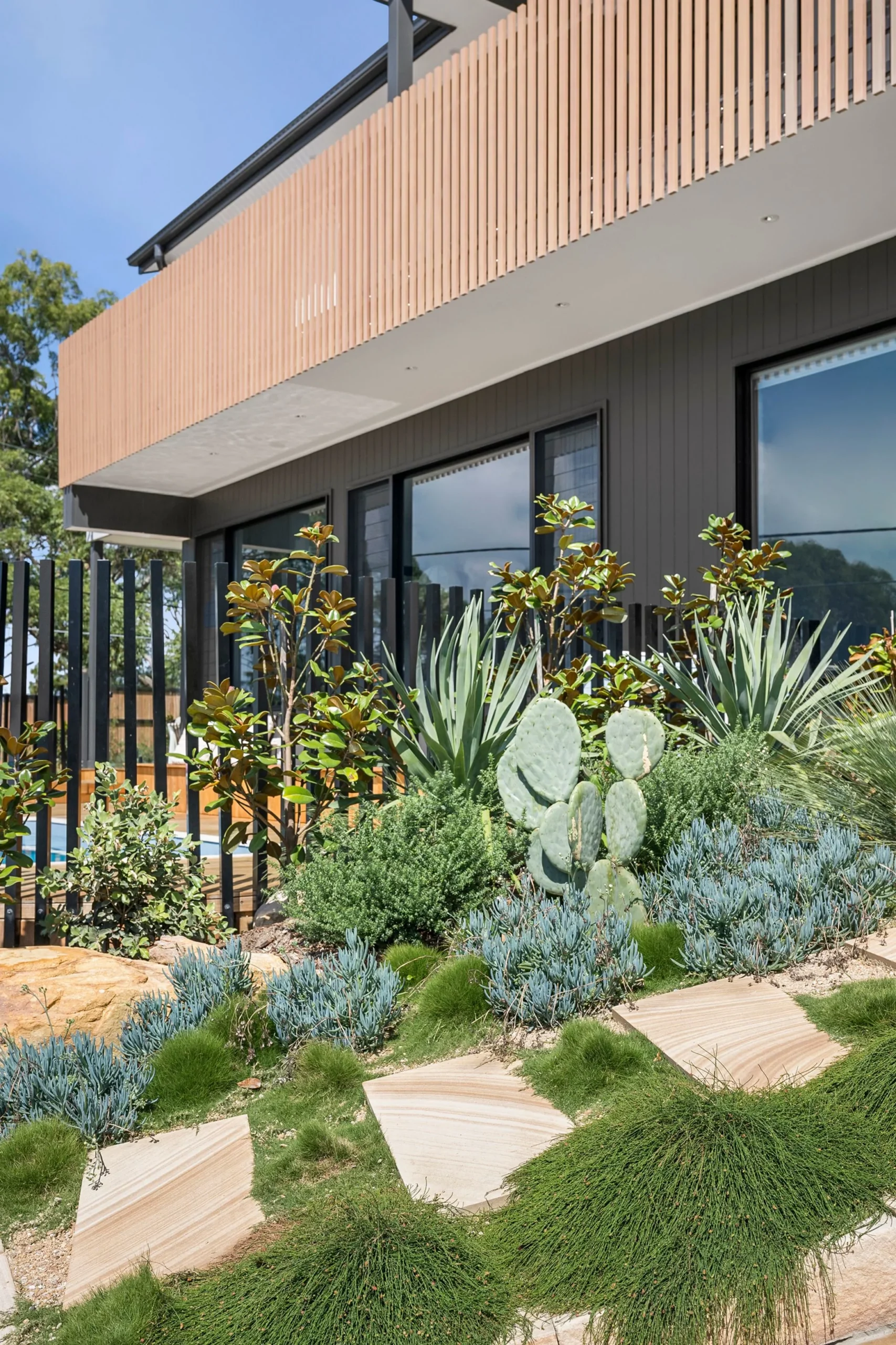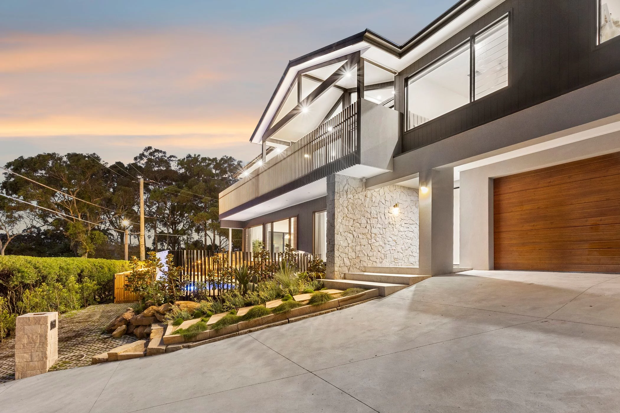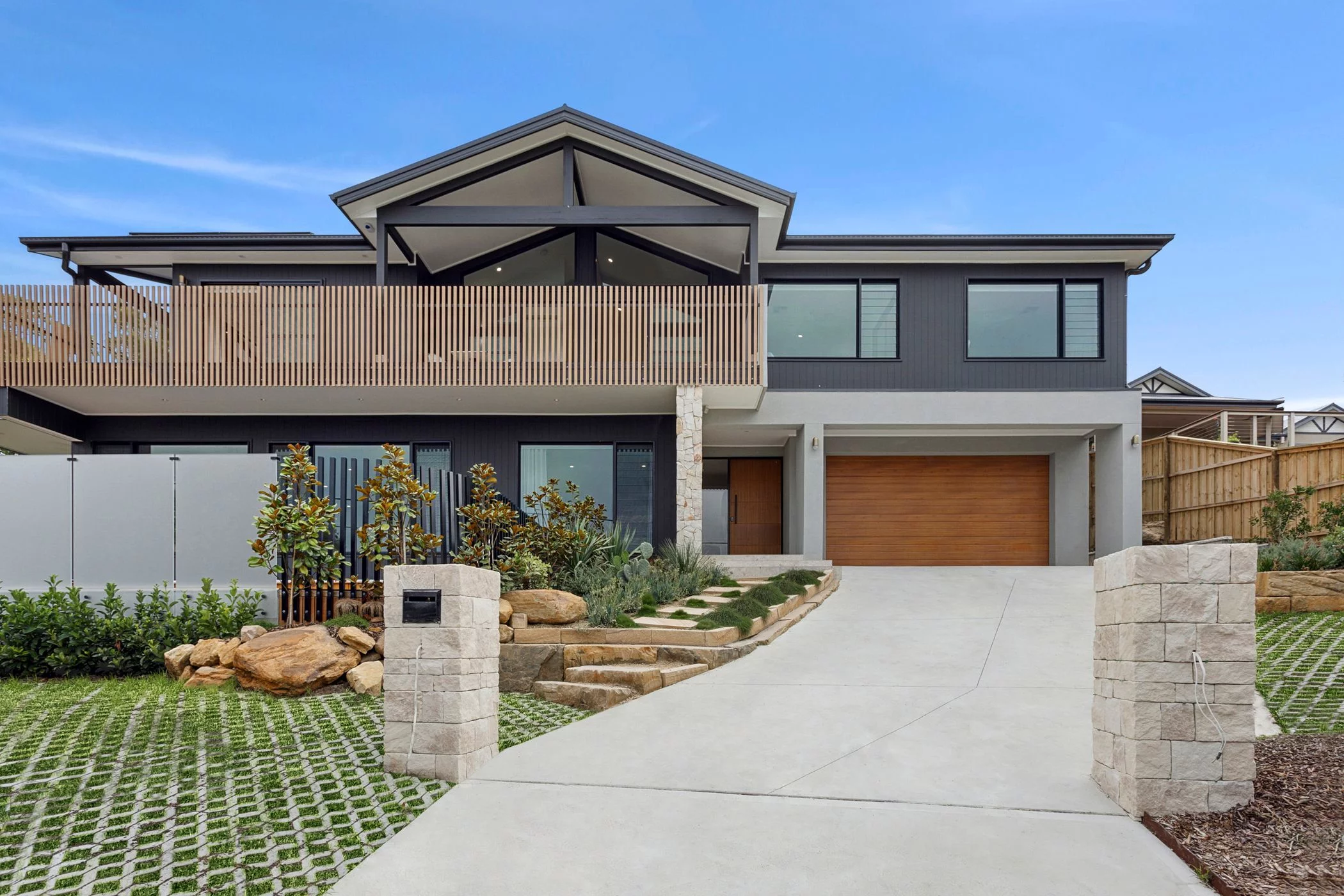 Summit was designed to sit confidently on its elevated block, with a facade that balances stone, dark cladding and warm timber tones. The upper-level gable and screened balcony create a strong focal point from the street, while the landscaped entry softens the scale of the home and grounds it within its surroundings.